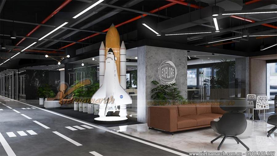 Không gian làm việc là khu vực mình cực thích, ấn tượng với hình ảnh con tàu vũ trụ đặt ngay cạnh hành lang trong văn phòng làm việc, được trang trí với nhiều cây xanh tạo không gian xanh và mang tính thẩm mỹ cực cao cho một văn phòng coworking space. Không gian văn phòng mở, mang tính sáng tạo cao, nếu không tin bạn hãy xem những hình ảnh dưới đây.