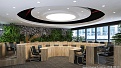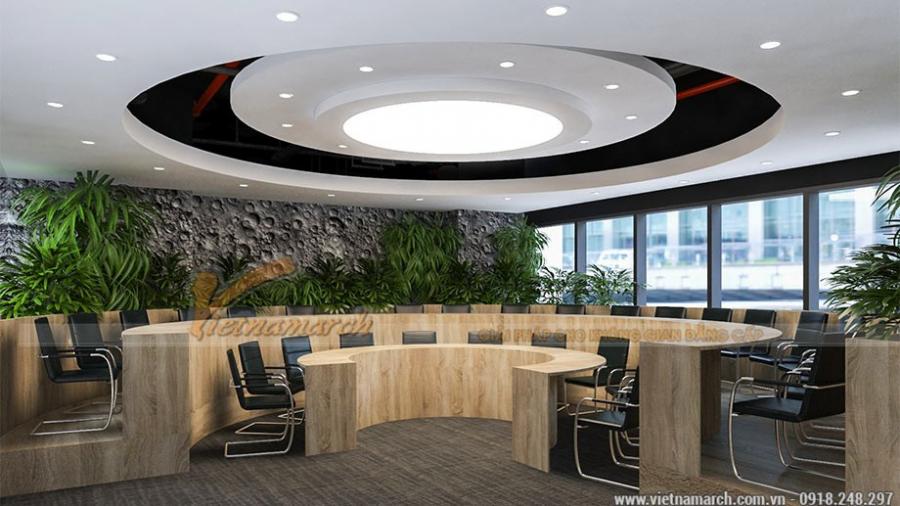 Khu vực phòng họp cực kì nổi bật. Trần nhà được sử dụng trần thạch cao, tạo thành cung vòng tròn tựa như con tàu vũ trụ. Dãy bàn họp dạng hình bán nguyệt với chất liệu gỗ thân thiện với môi trường, tạo thành 2 vòng cung ấn tượng. Nơi đây có sức chứa lên đến 30 người.
